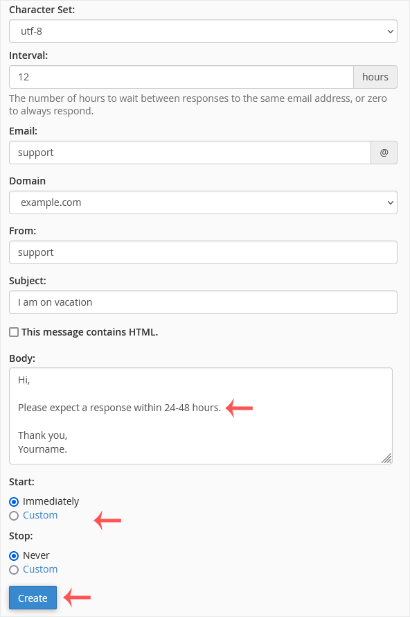 • Email: Enter your email address on which you want to enable autoresponder. To enable auto responder on [email protected], enter support in the email field.