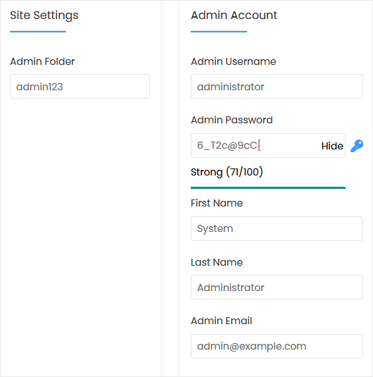 • Admin Username: Your new OctoberCMS username (for security reasons, do not use the administrator or the admin username).